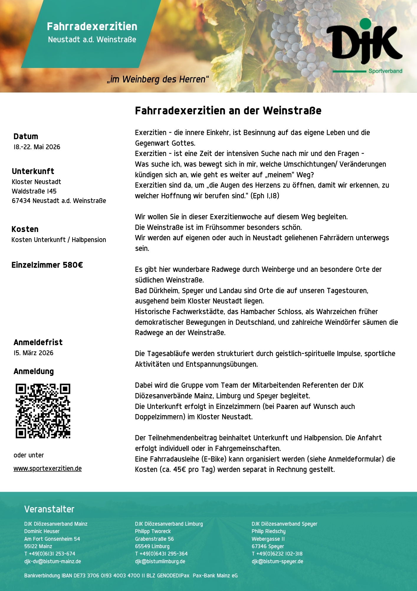 Vom 18. bis 22. Mai 2026 laden die DJK-Diözesanverbände Mainz, Limburg und Speyer zu besonderen Fahrradexerzitien ins Kloster Neustadt ein.